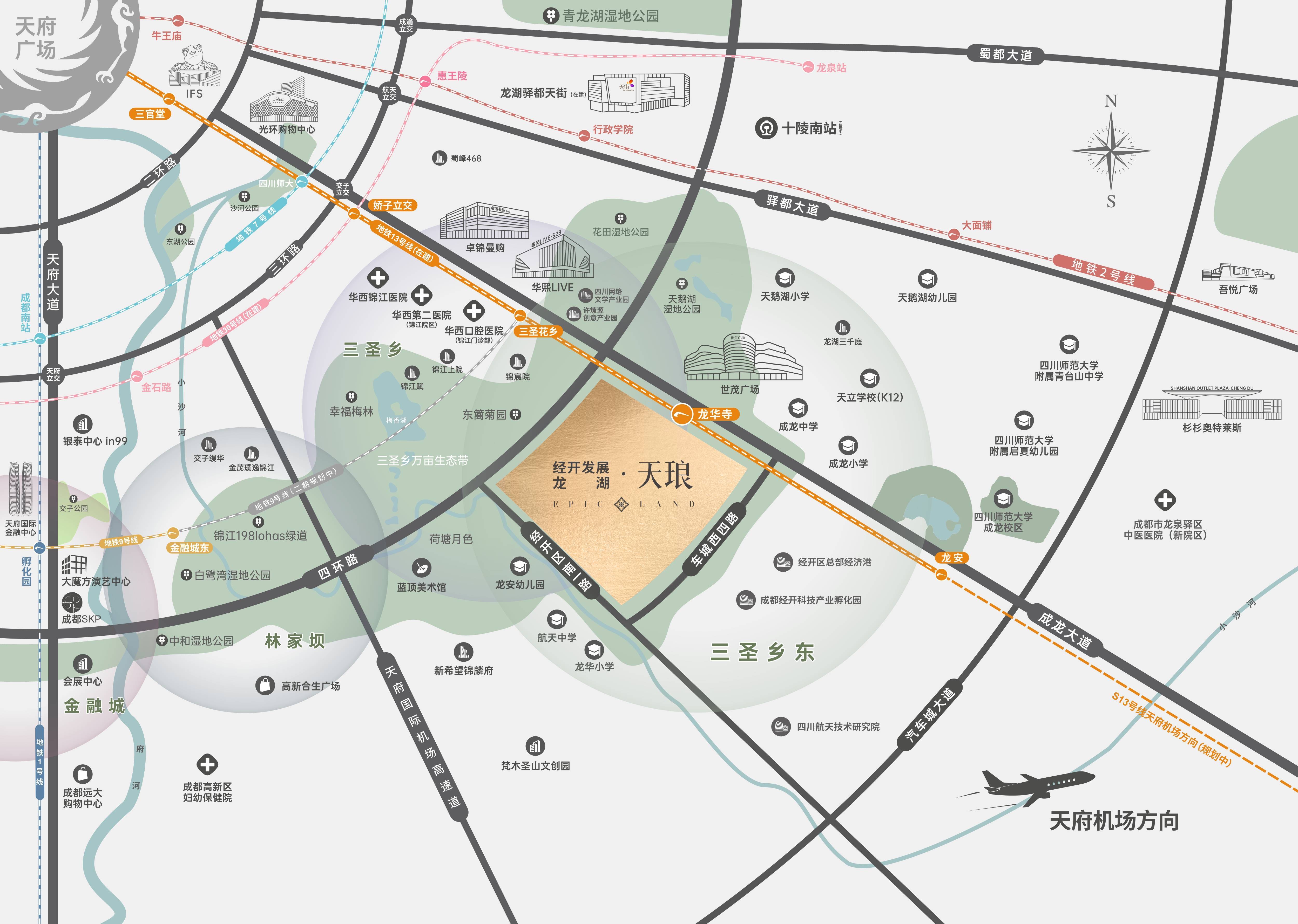 - 配套资源丰富:该板块可深度共享三圣乡的高阶配套,周边有世茂广场、卓锦曼购、华熙LIVE·528等八大商圈环绕。医疗方面,1站即达华西第二医院、华西口腔医院、华西医院锦江分院三大医疗资源。教育上,有龙安幼儿园、龙华小学、航天中学、天立学校等全龄段教育资源。生态方面,约3000亩白鹭湾湿地公园、约15000亩三圣乡“城市绿肺”环伺左右。