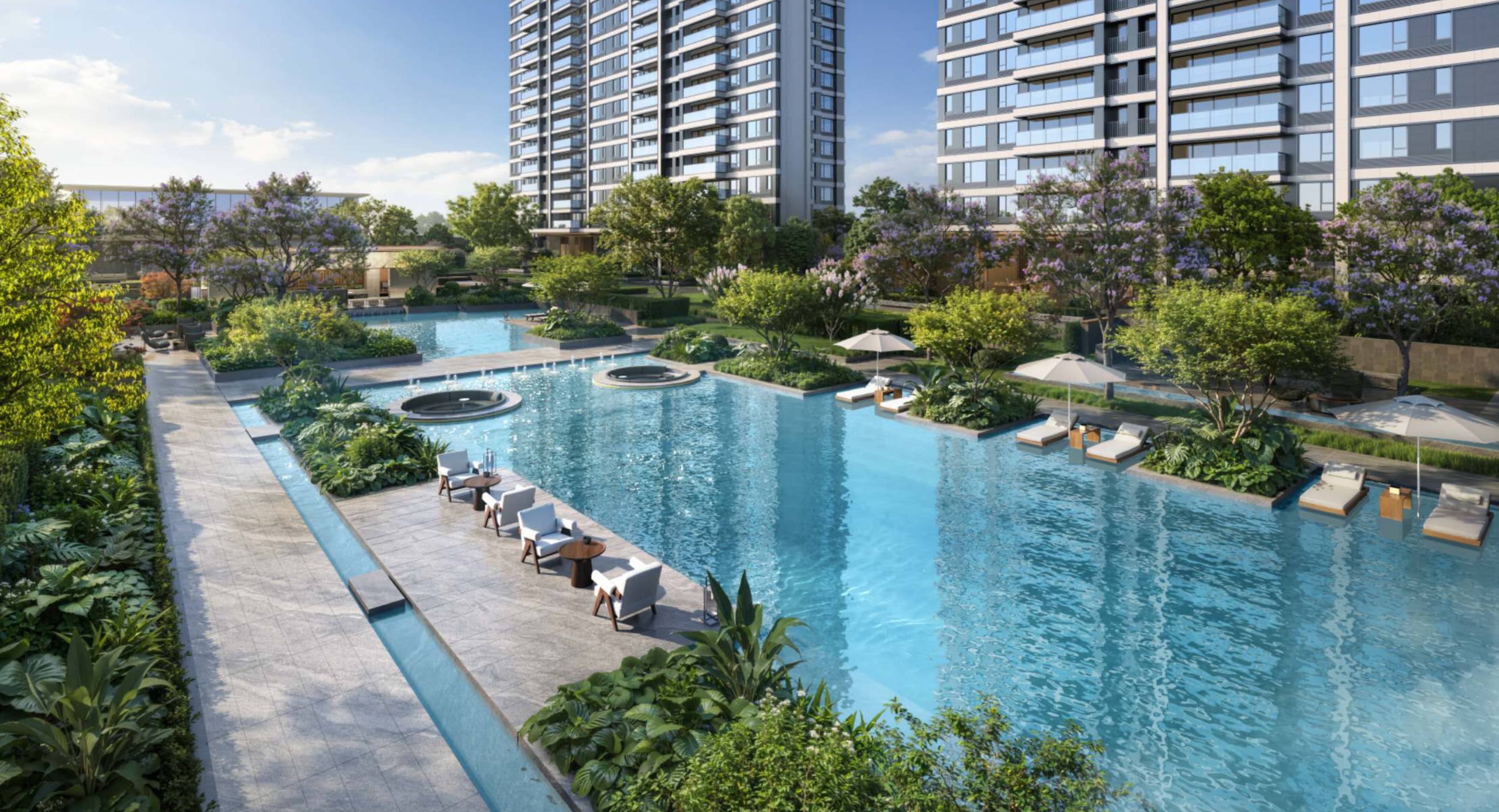 占地约92亩,容积率2.77、绿地率30%,约15亩中央公园+150米水系中轴,超140米纵向楼间距,视野与私密性拉满。
