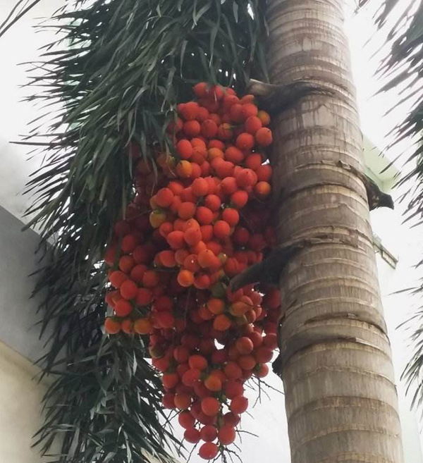 狐尾椰子一般在在10月-12月开花,花朵比较小,花白色,花后会长出青色的果实,果实卵形,长6-8厘米,果实自然成熟会变红,红通通的果实非常喜人。狐尾椰子的果实虽然好看,但是味道酸涩,难以下咽,基本上没有人会吃。